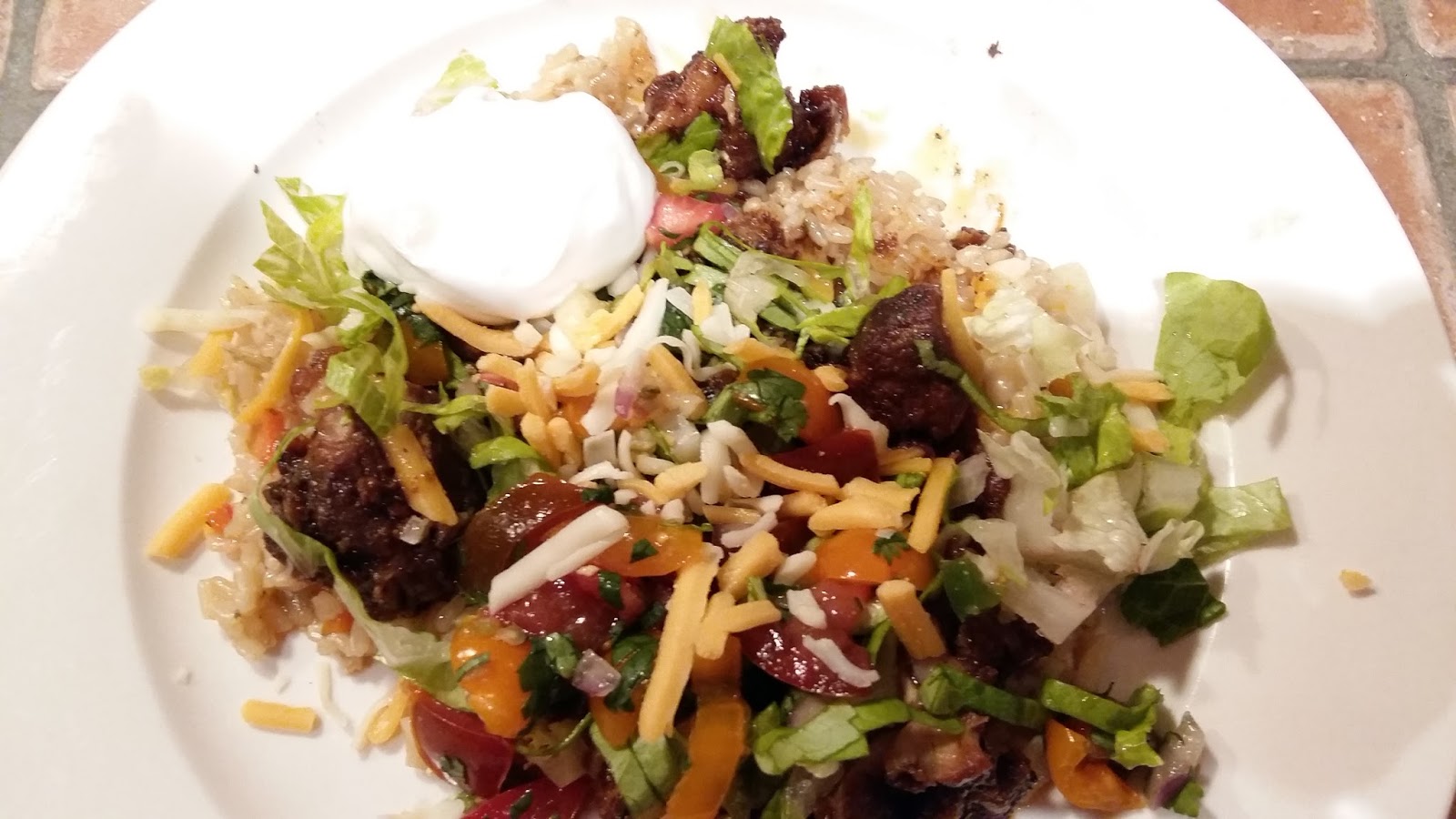 Now, to put together your “Chipotle like” bowl or taco- make some brown rice and mix with a bit of lime juice and cilantro, put the pulled or shredded Carnitas on top, add any fresh stuff you love- crispy lettuce, red cabbage, diced tomato, a